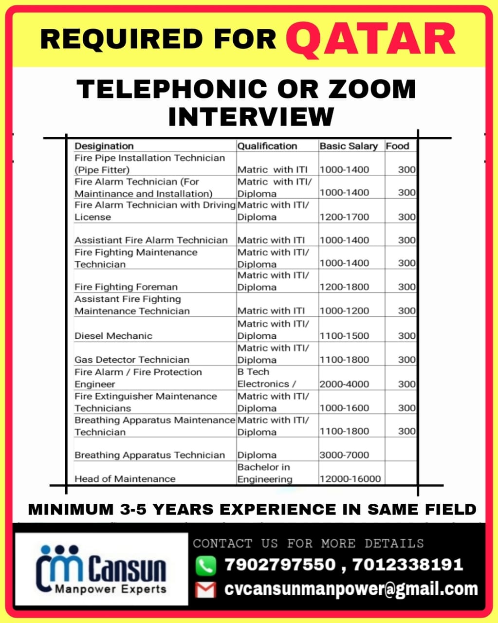 | Fire alarm technician (for maintenance and installation) | 1000 - 1400 QAR | |