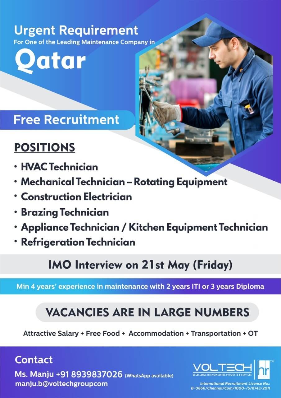 Free recruitment to Qatar - Maintenance company