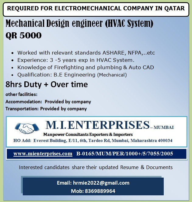 | Mechanical design engineer (HVAC system) | 5000 QAR |