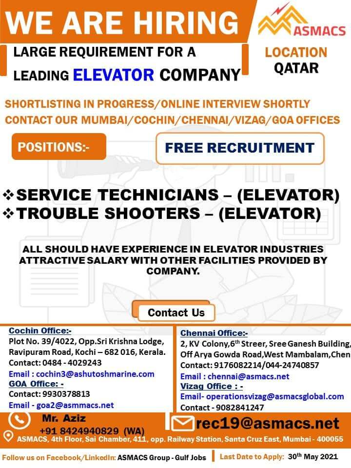 Free recruitment to elevator company in Qatar