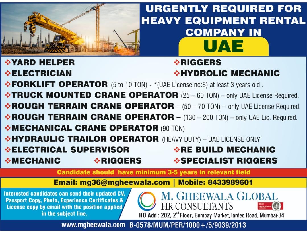 UAE job vacancy 2021 - Heavy equipment rental company