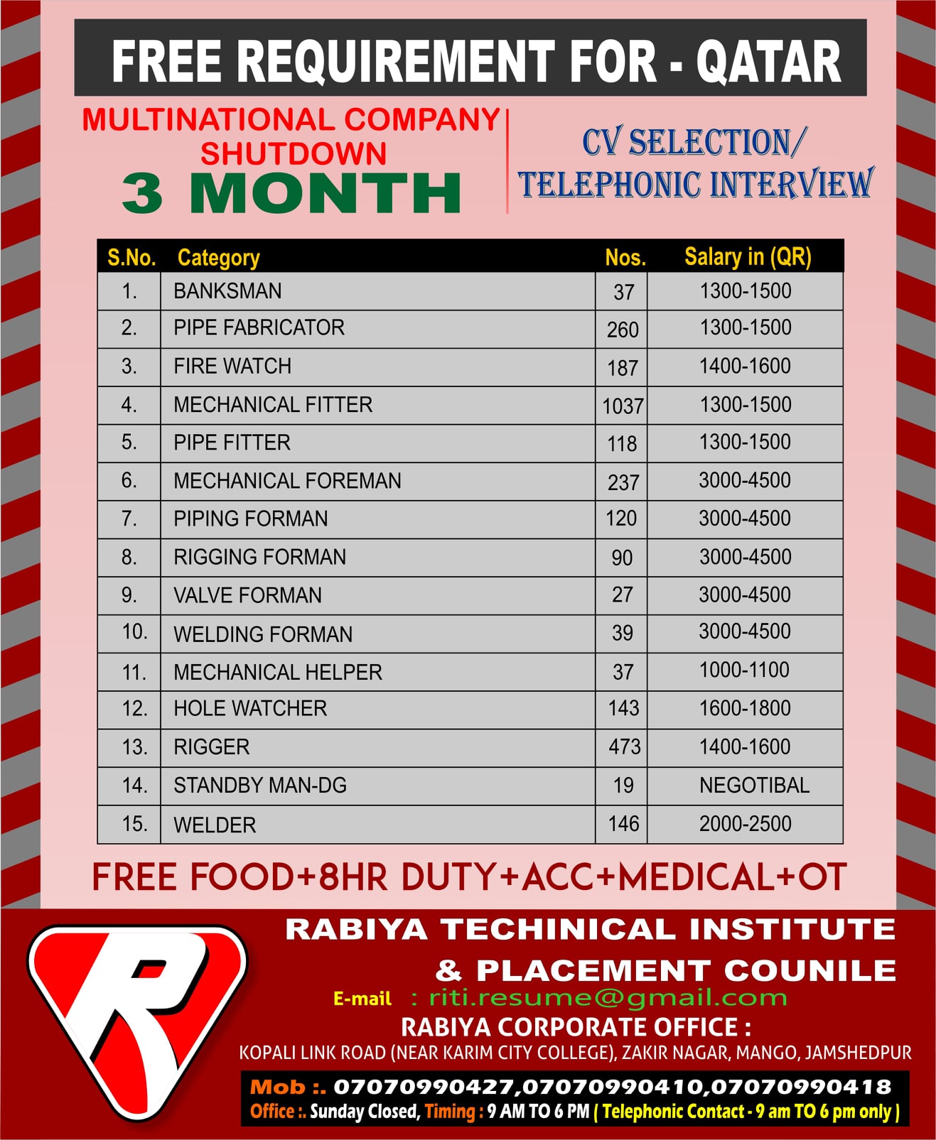 Free recruitment to qatar - 3 Months shutdown jobs in Multinational company