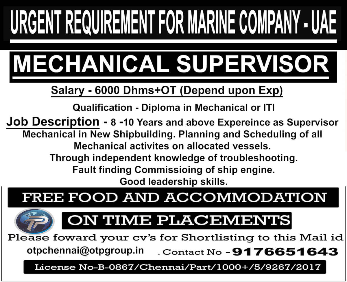 Mechanical supervisor job in UAE - Marine company