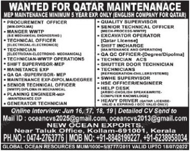 Qatar jobs 2021 for Indian - Recruitment to maintenance project