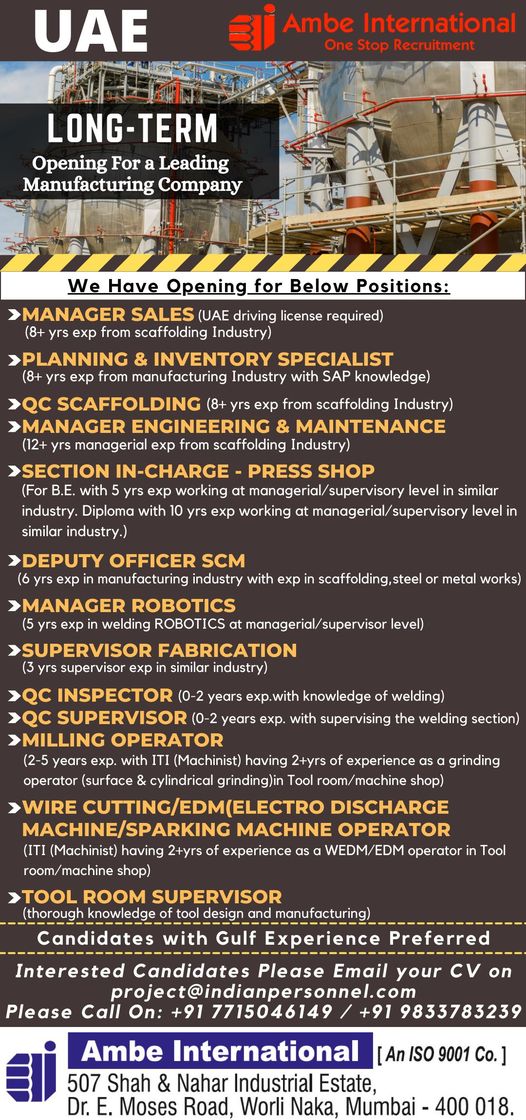 UAE job vacancies for Indian 2021 - Manufacturing company