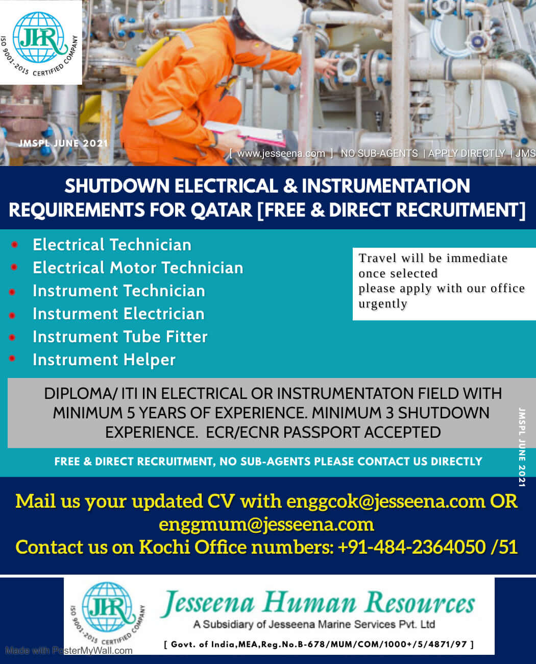 Diploma/ITI in electrical or instrumentation field with min. 5 years of experience.
