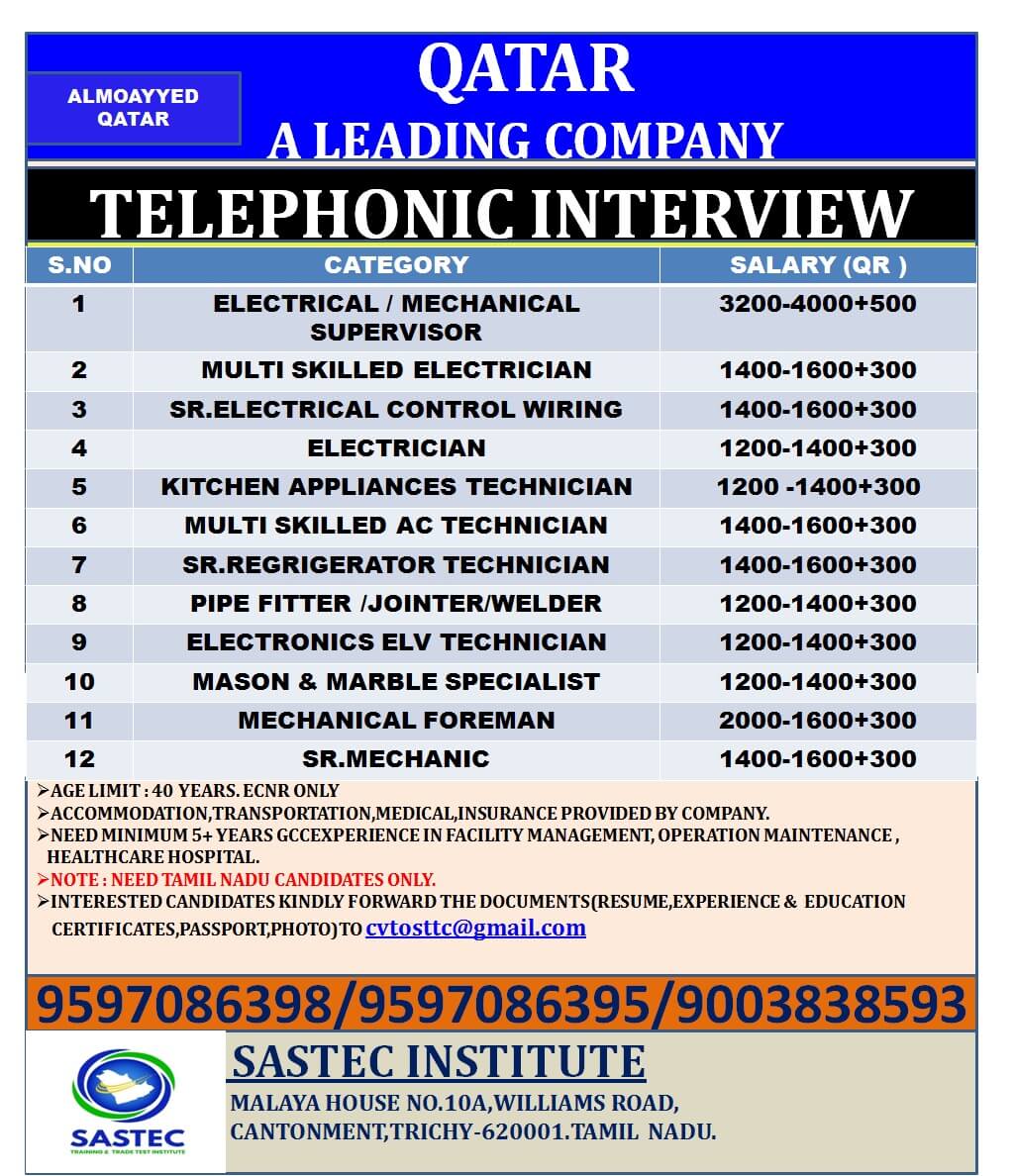 | Multi skilled electrician | 1400 - 1600 QAR | |