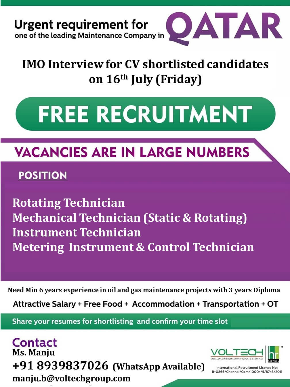 Free recruitment jobs in qatar - Maintenance company
