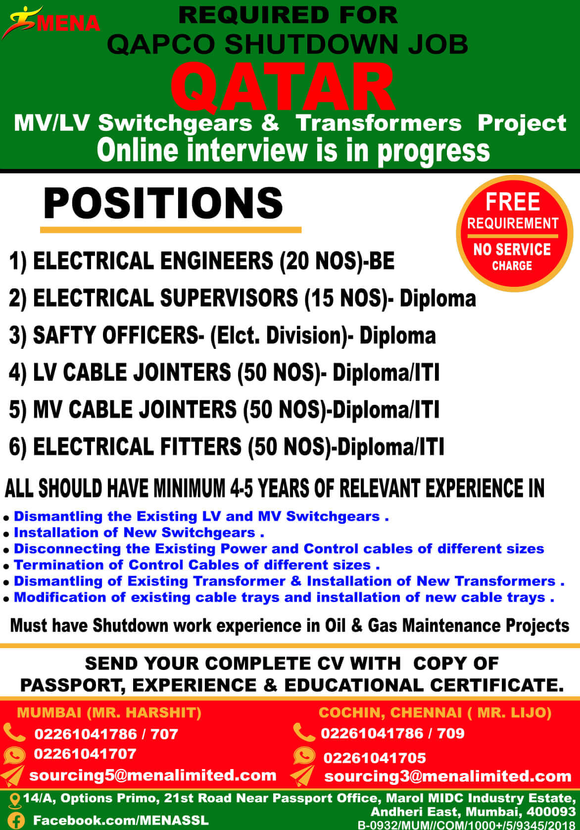 Free recruitment to qatar - MV/LV switchgears & transformers project