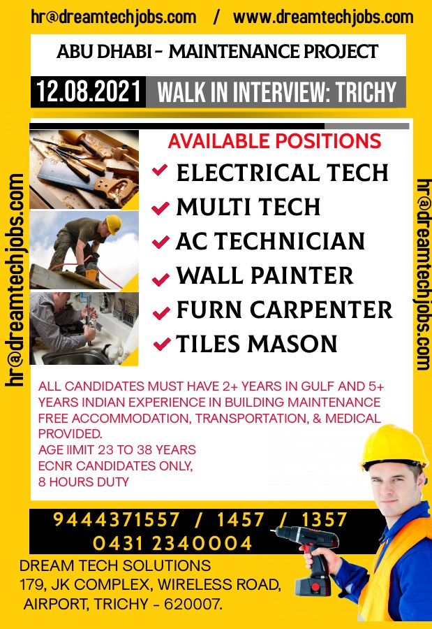 Candidates must have minimum 2 years experience in Gulf and 5 years Indian experience in building maintenance