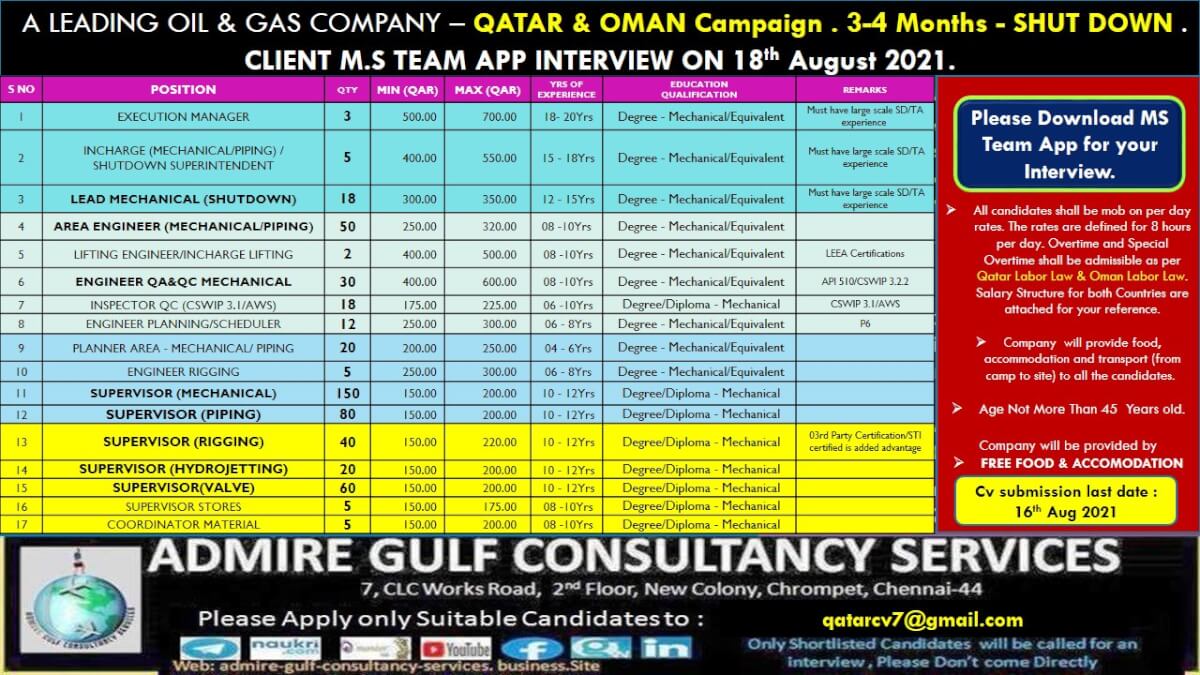 Oil and gas jobs in Qatar & Oman 2021 - Shutdown project direct interview