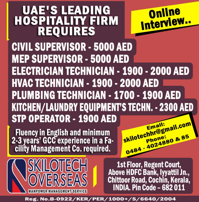 UAE job vacancies for Indian - Online interview