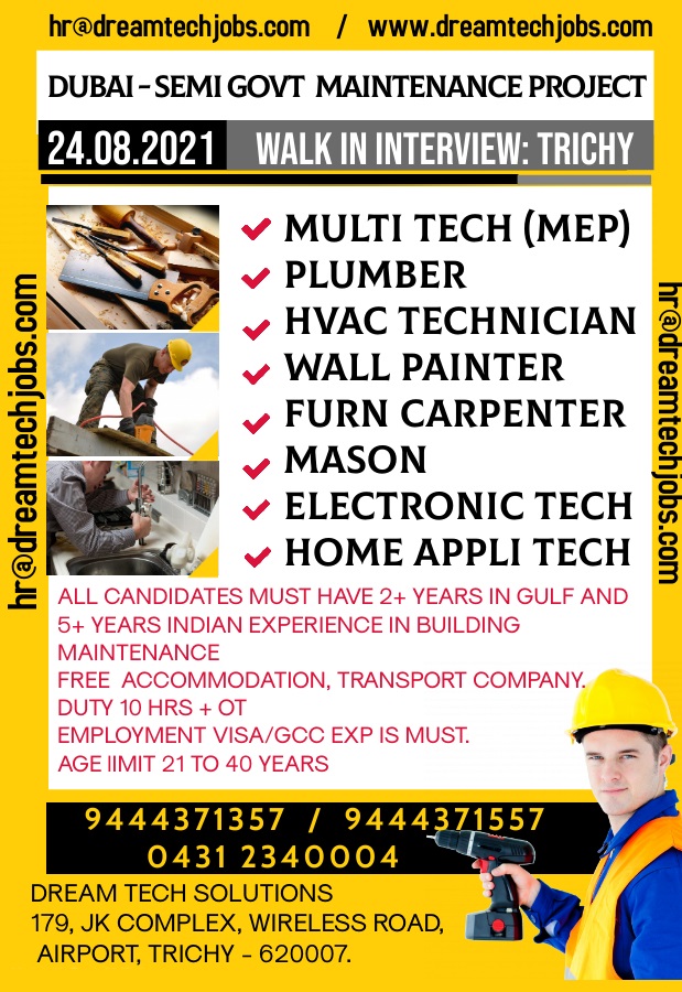 All candidates must have minimum 2 years experience in Gulf & minimum 5 years Indian experience in building maintenance