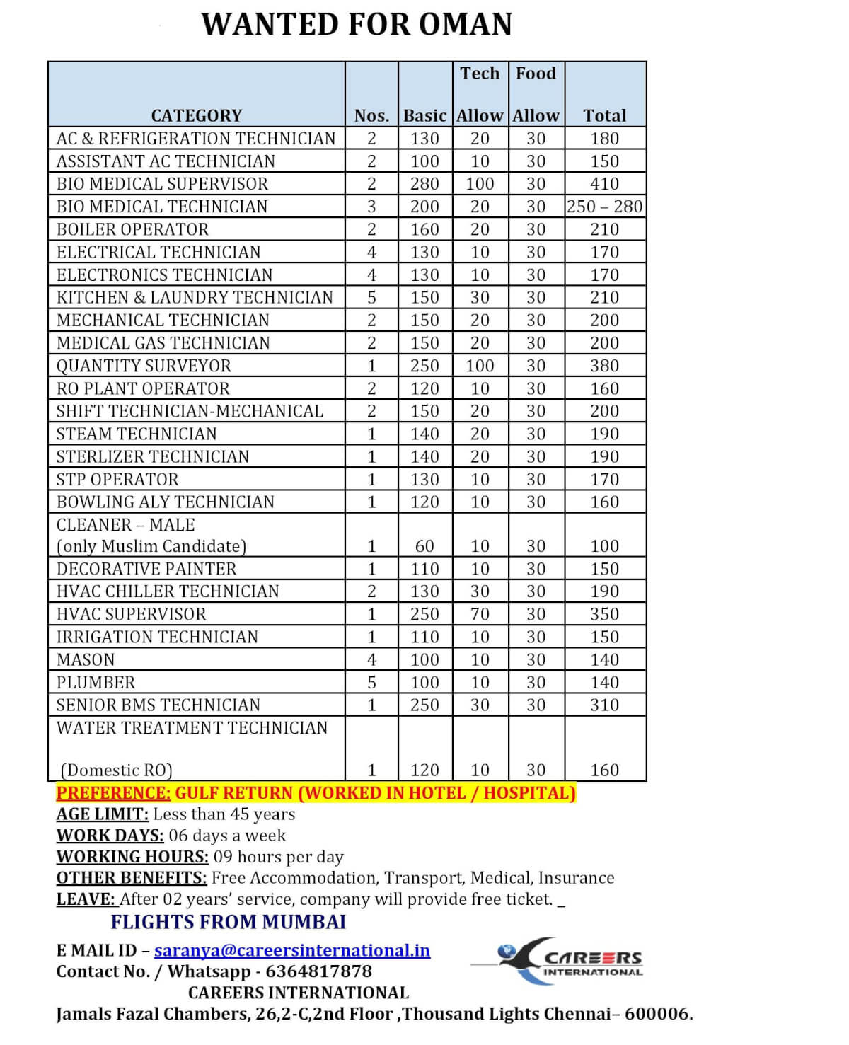 | Cleaner - male (only Muslim candidate) | 1 | 160 OMR |