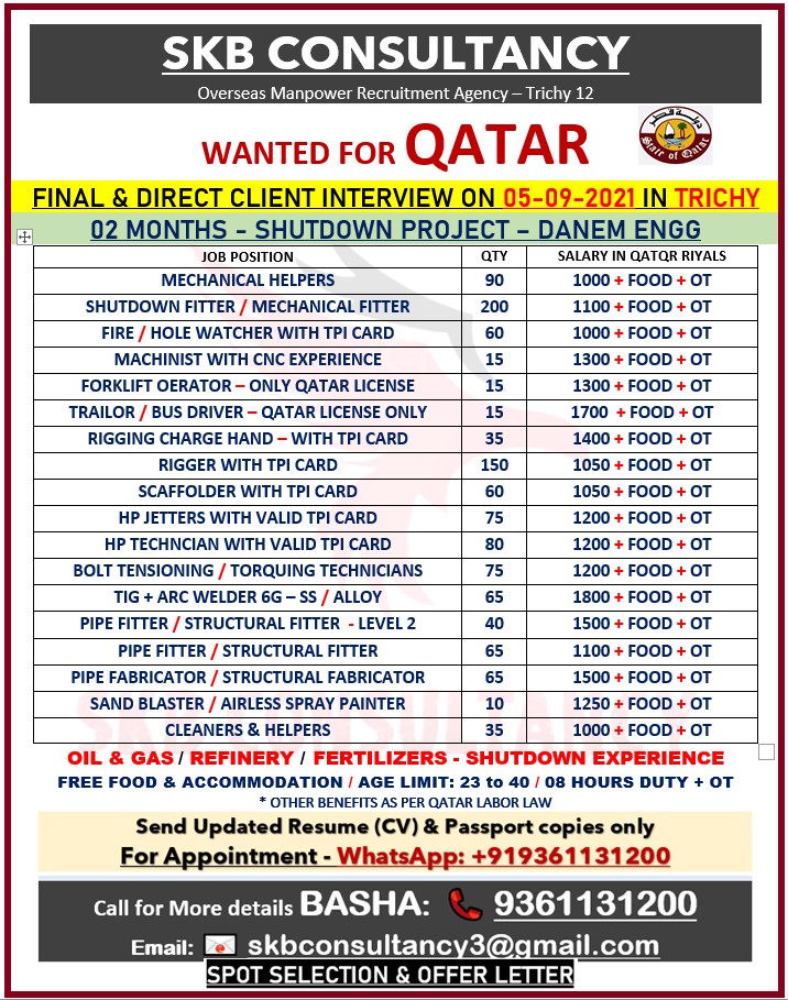 | Pipe fitter / structural fitter | 65 | 1100 QAR |