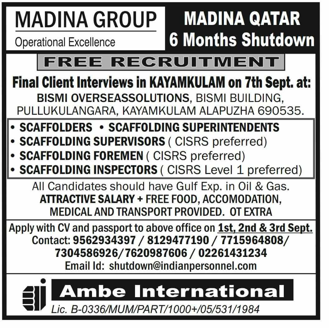 Apply with Cv and Passport to office on 1st, 2nd & 3rd September