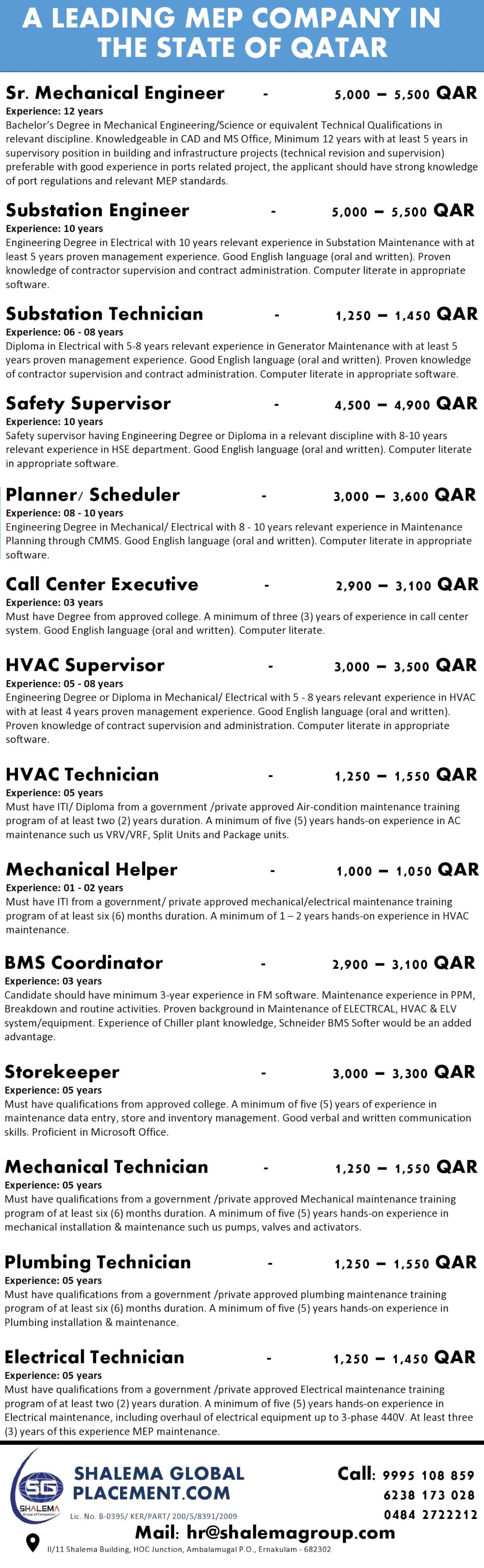 | HVAC supervisor | 3000 - 3500 QAR | |