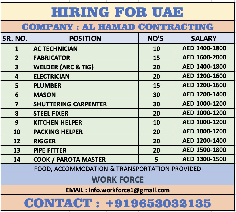 | Shuttering carpenter | 30 | 1000 - 1200 AED |