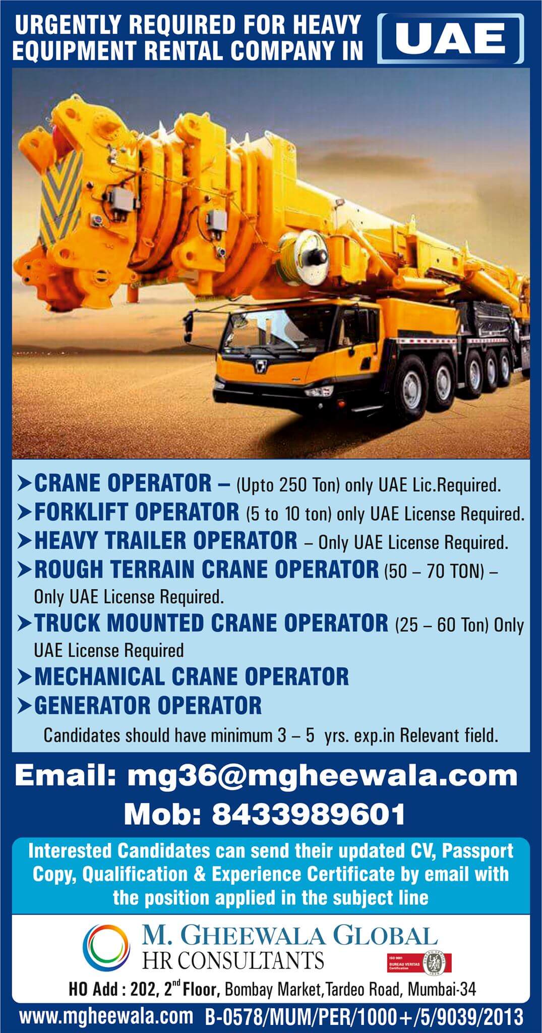 | Truck mounted crane operator (25 - 60 ton) (UAE license) | ||