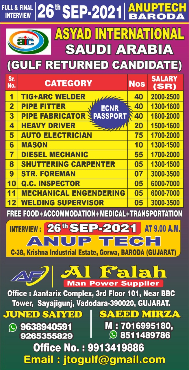 Walk-in-interview on 26th September 2021 at Anup Tech, C - 38, Krishna Industrial Estate, Gorwa, Baroda (Gujarat)
