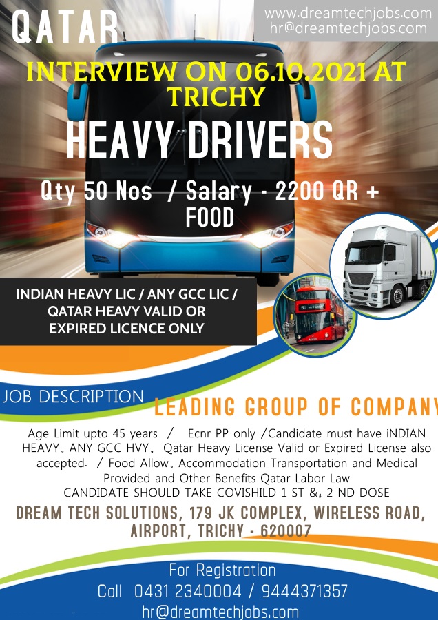 Candidates must have Indian heavy, any GCC heavy, valid / expired Qatar heavy license