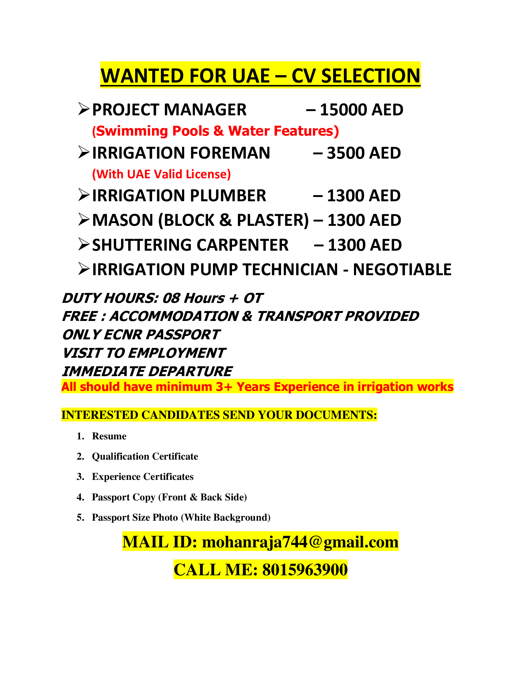 | Irrigation foreman | 3500 AED | |