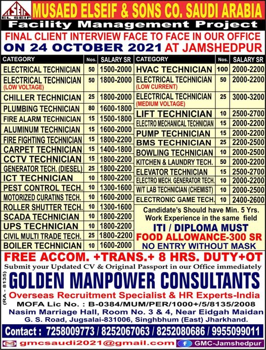 | Electrical technician (Low voltage) | 50 | 1800 - 2000 SAR |