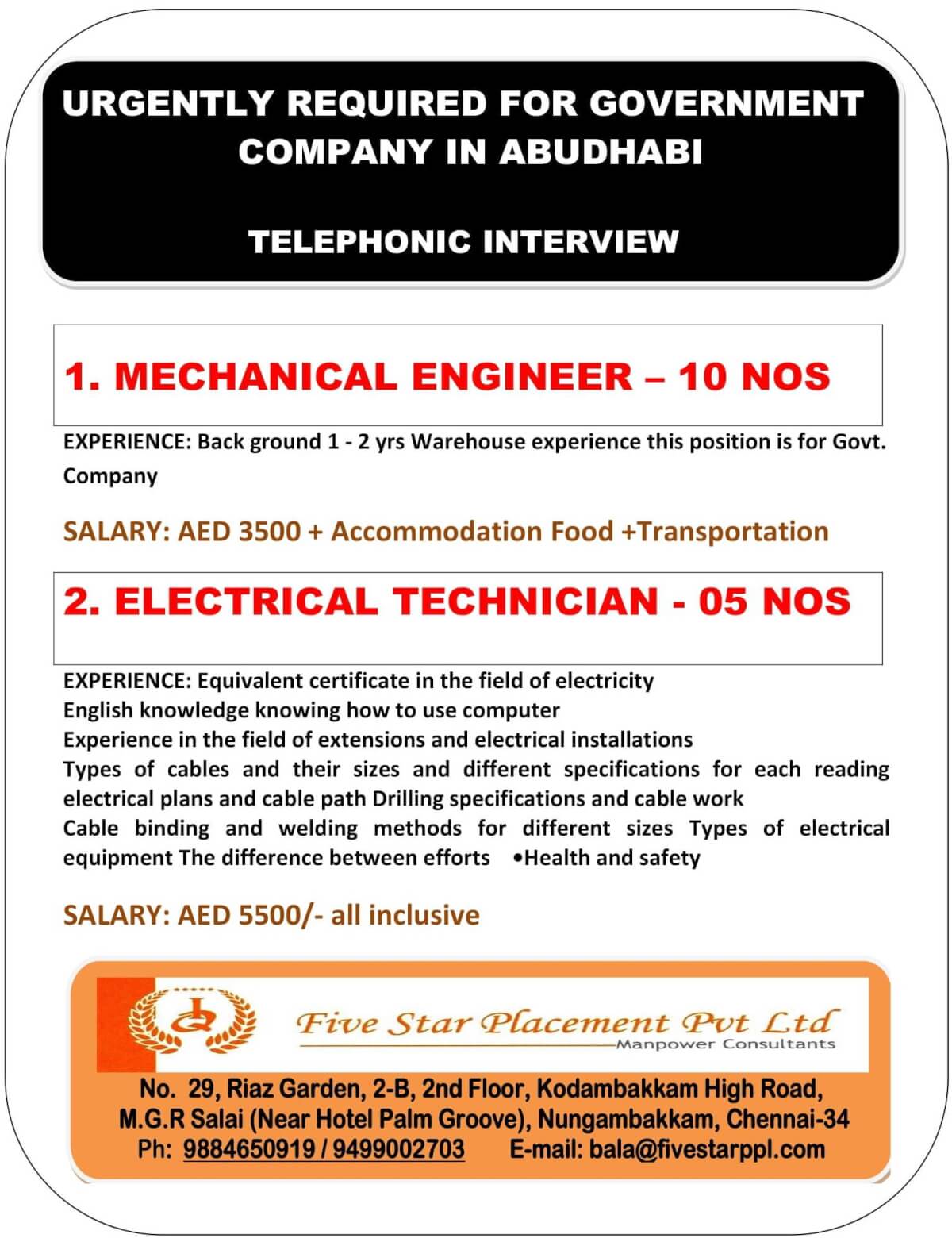 | Electrical technician - maintenance | 5 | 5500 AED |
