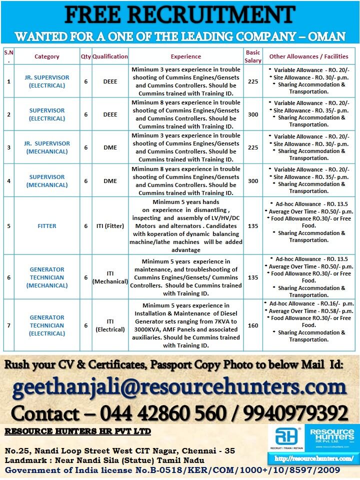 Free recruitment abroad jobs - Wanted for Oman