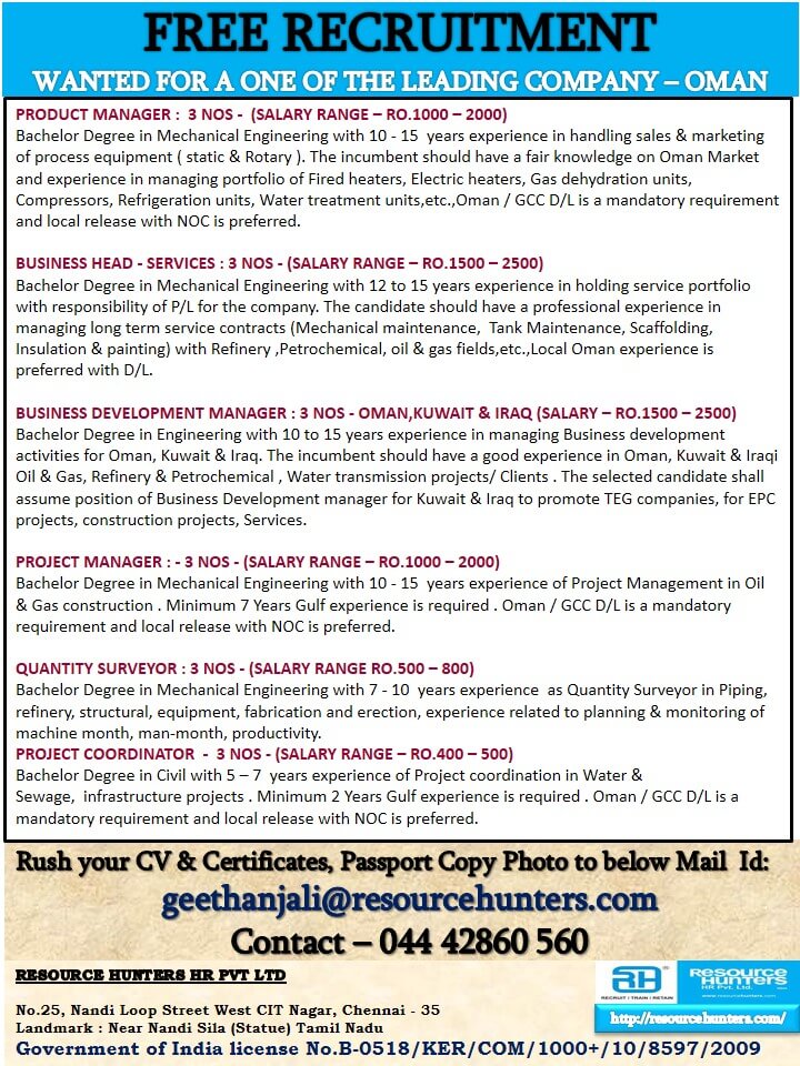Free recruitment abroad jobs - Wanted for Oman