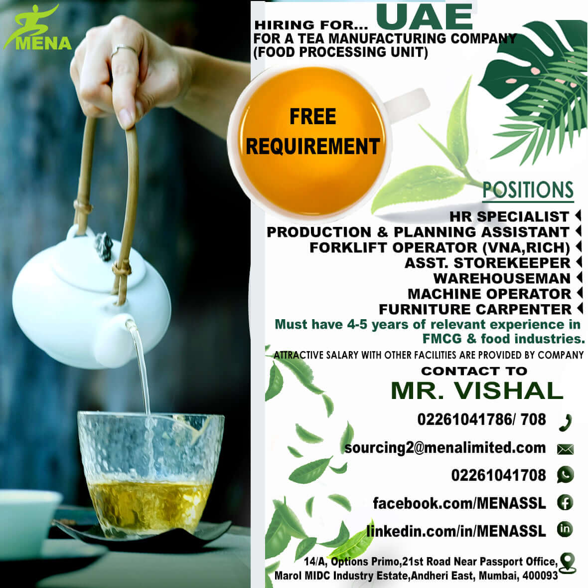 Free recruitment to UAE - Tea manufacturing company