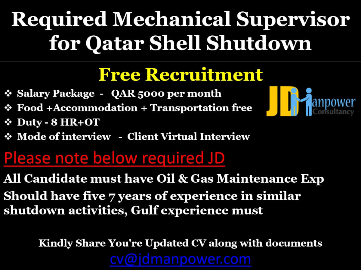 Mechanical supervisor jobs in Qatar - Free recruitment