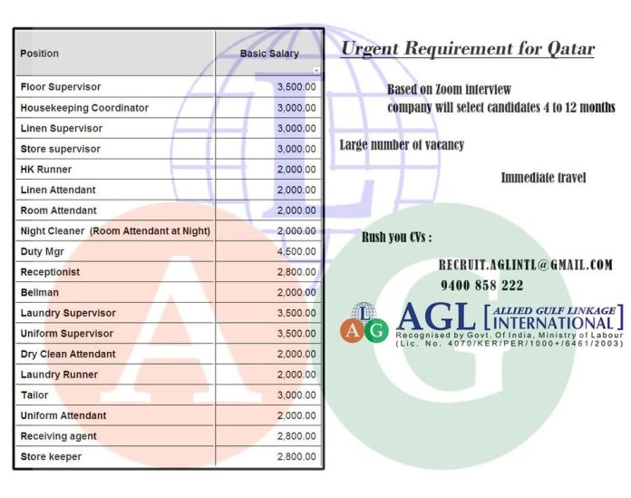 | Linen attendant | 2000 QAR | |