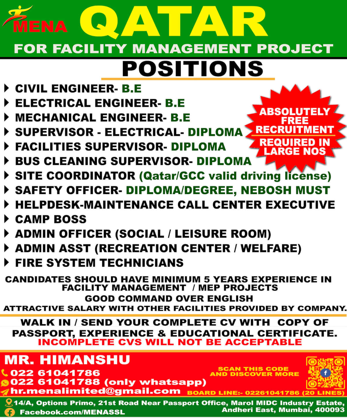 Free recruitment to Qatar - Facility management project