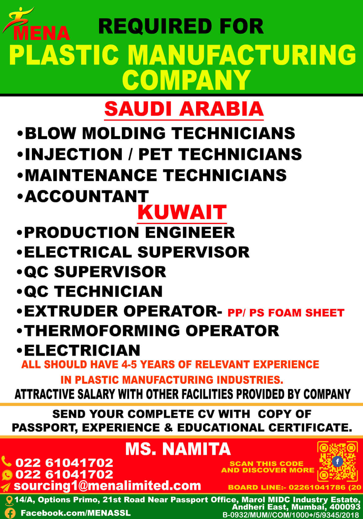 Recruitment to plastic manufacturing company in KSA & Kuwait