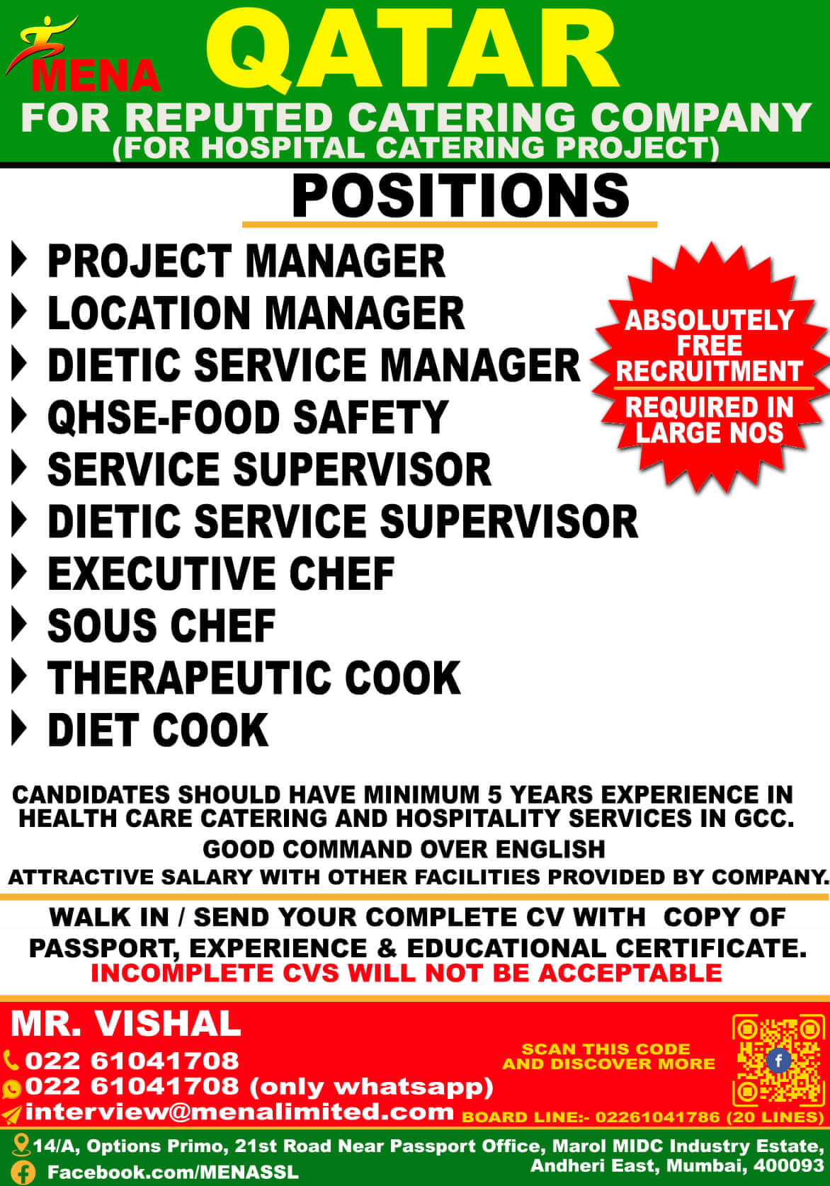 Free recruitment to Qatar - Catering company