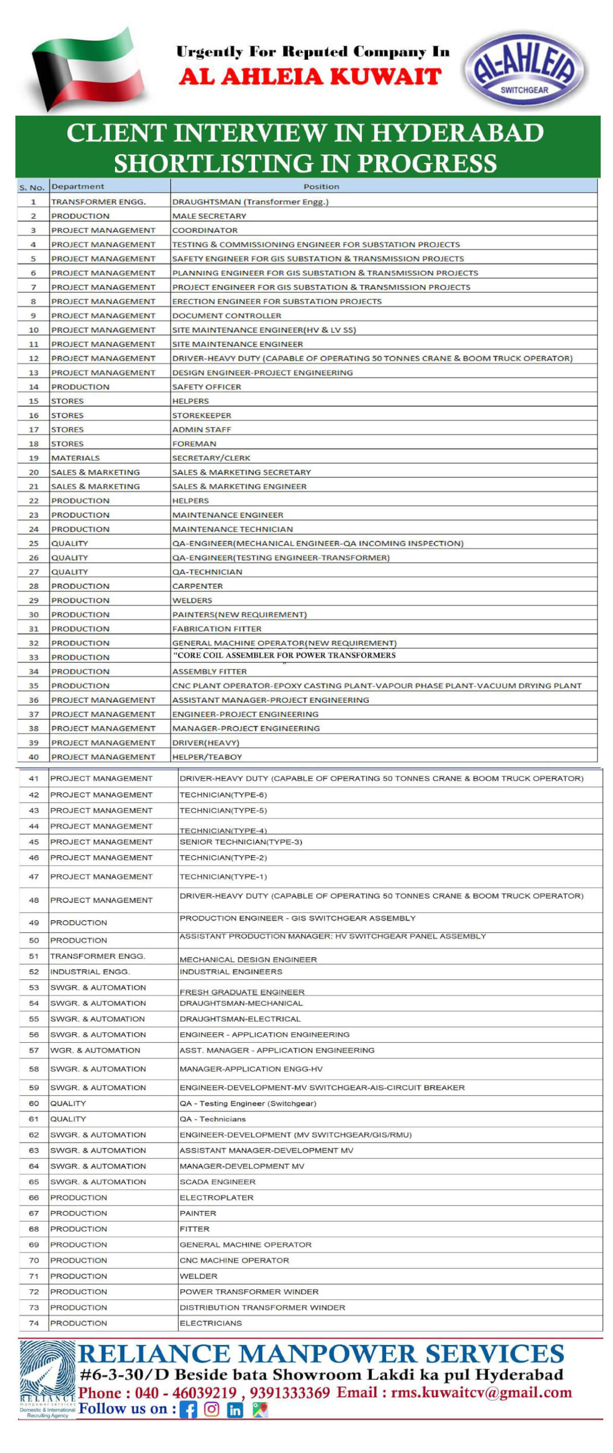 Al Ahleia switchgear Kuwait jobs - Large recruitment