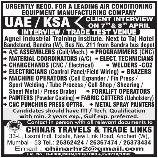 Walk-in-interview on 7th and 8th April 2022 at Agnel industrial training institute, next to taj hotel bandstand, bandra (w), bus no. 211 from bandra bus depot