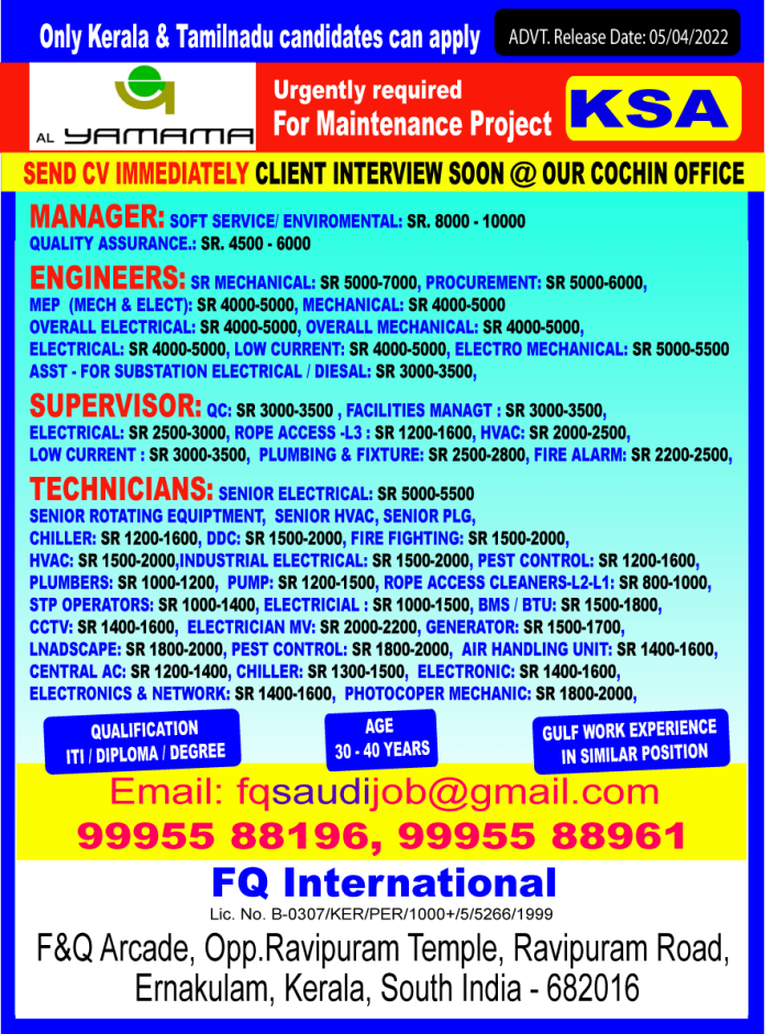 | Senior rotating equipment, Senior HVAC, Senior PLG, chiller technicians | 1600 SAR | |
