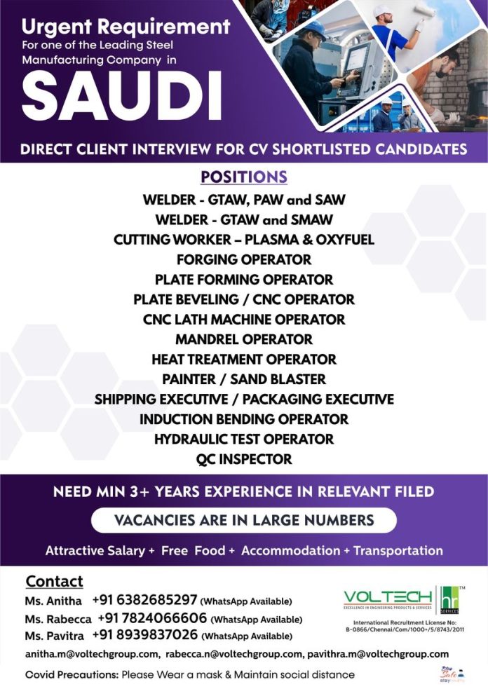 Steel plant Jobs in Saudi Arabia - Urgent requirement