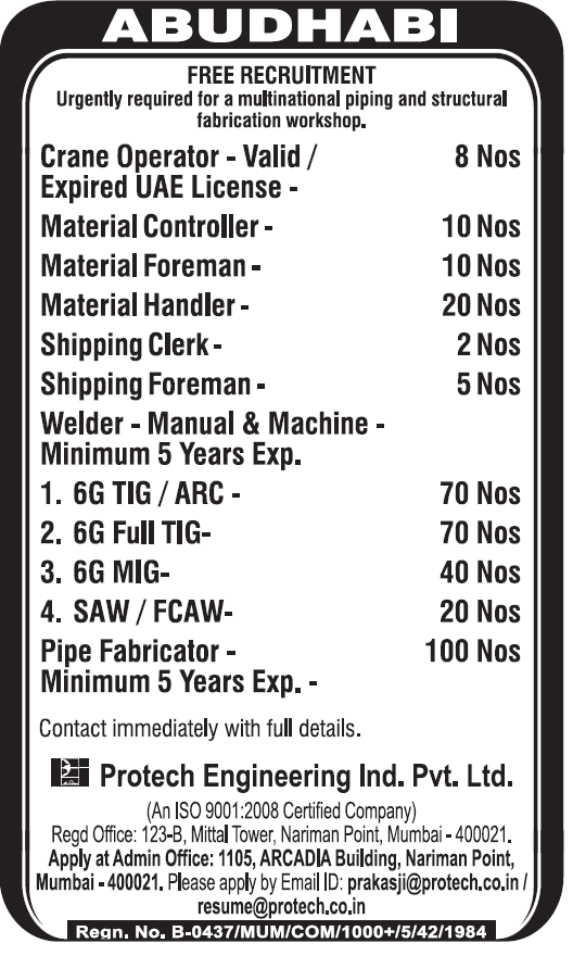 Free recruitment to Abu dhabi - Fabrication Workshop