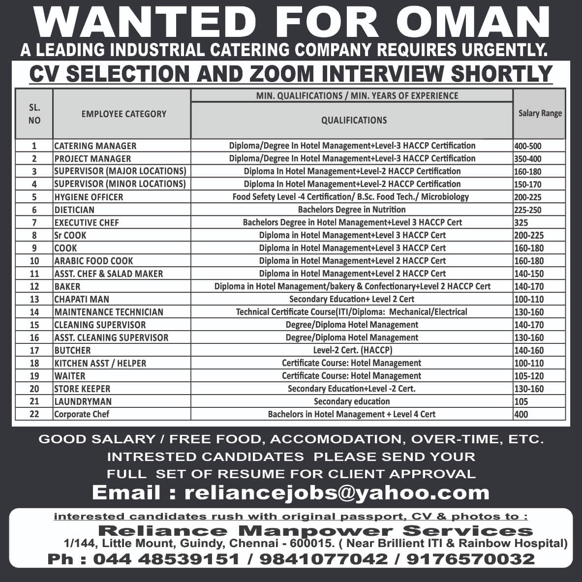 | Catering manager | 500 OMR | |
