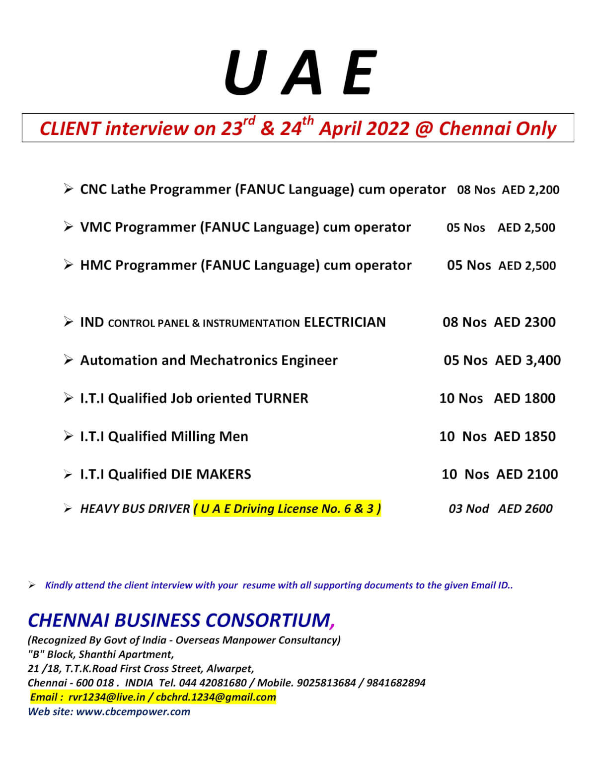 | HMC programmer (FANUC language) cum operator | 5 | 2500 AED |
