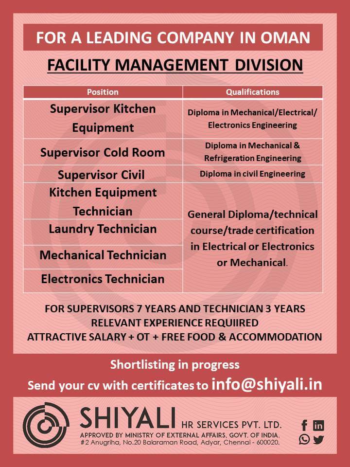 Oman jobs for Indian - Facility Management Division