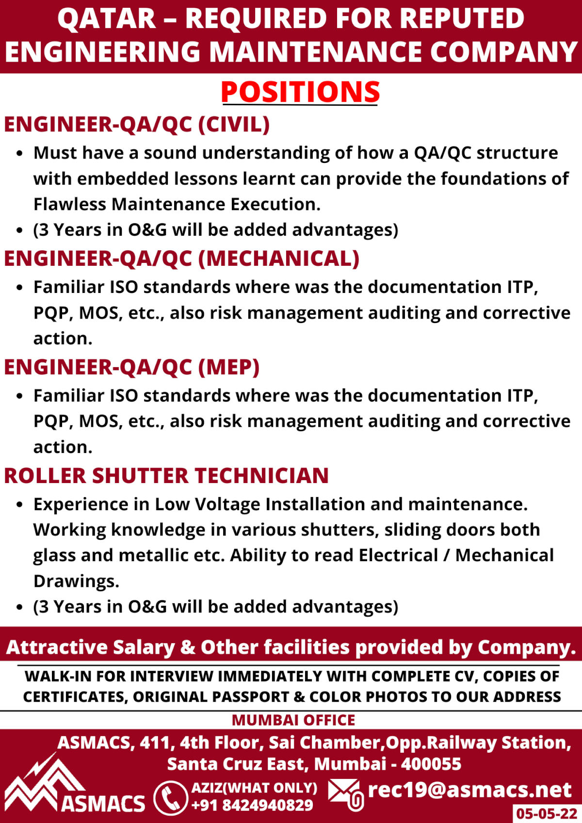 Wanted for Qatar - Engineering Maintenance Company