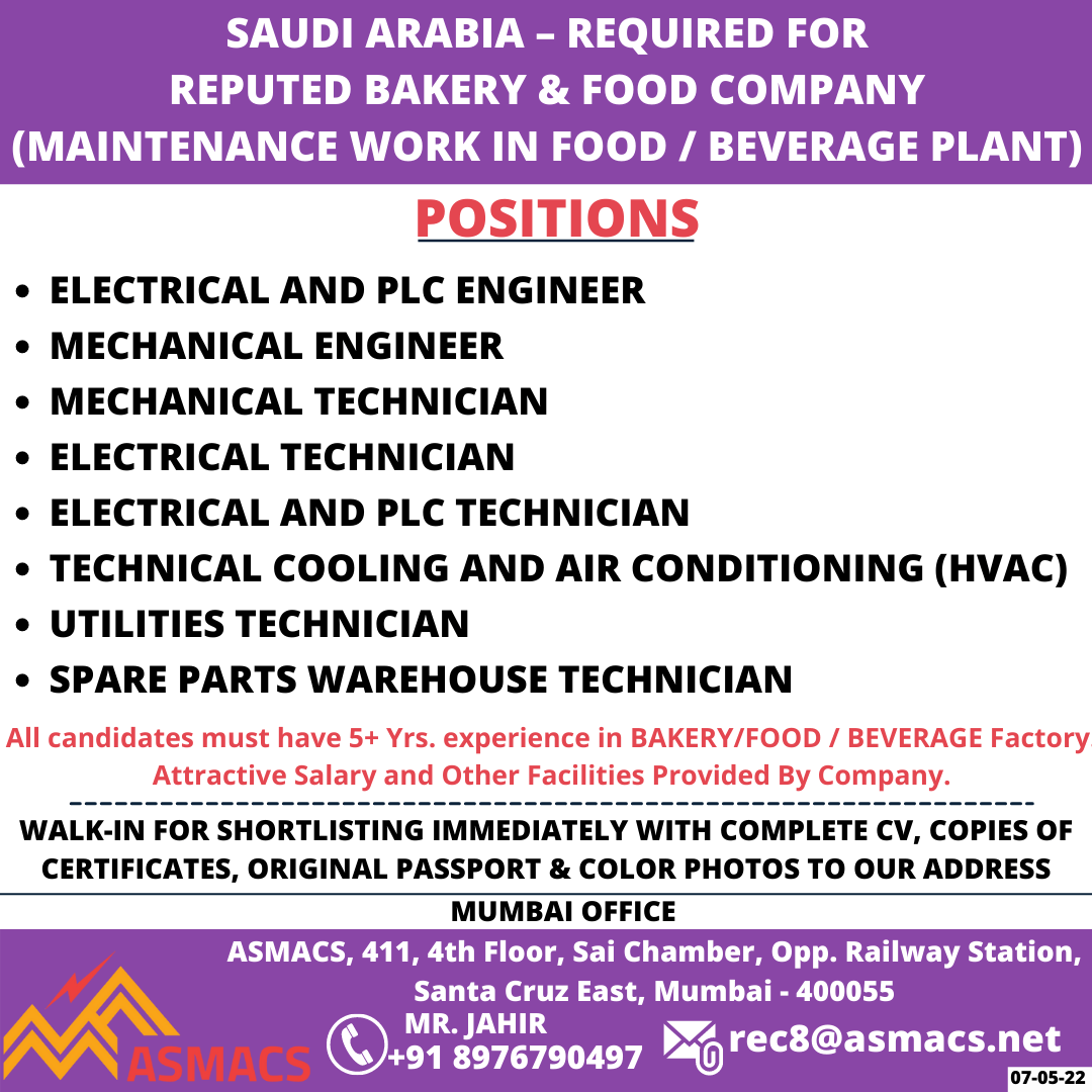 All candidates should have 5+ years of experience in bakery/food/beverage factory