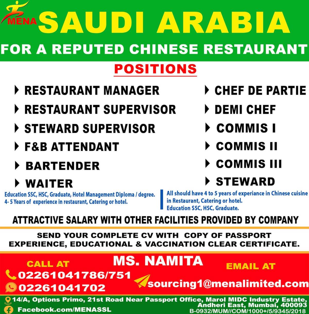 Restaurant job in Saudi Arabia - A reputed chinese restaurant