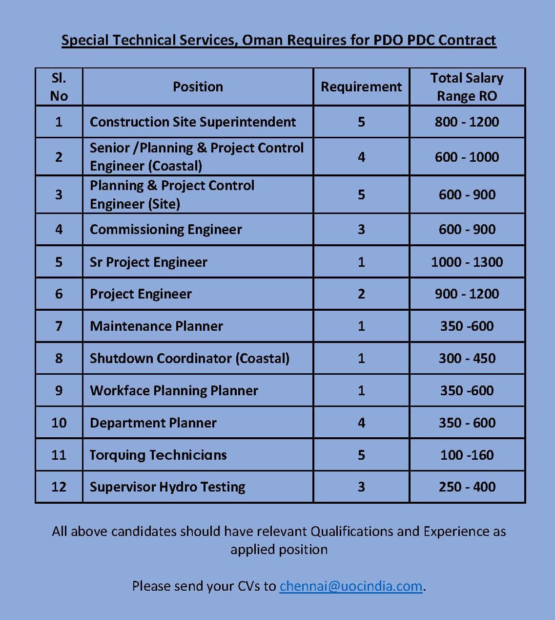 | Project engineer | 2 | 1200 OMR |