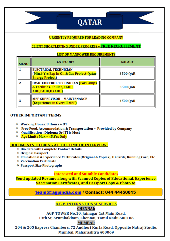 | HVAC control technician (for camps, facilities, chiller, CAHU, AHU, FAHU, DXAHU) | 3500 QAR | |