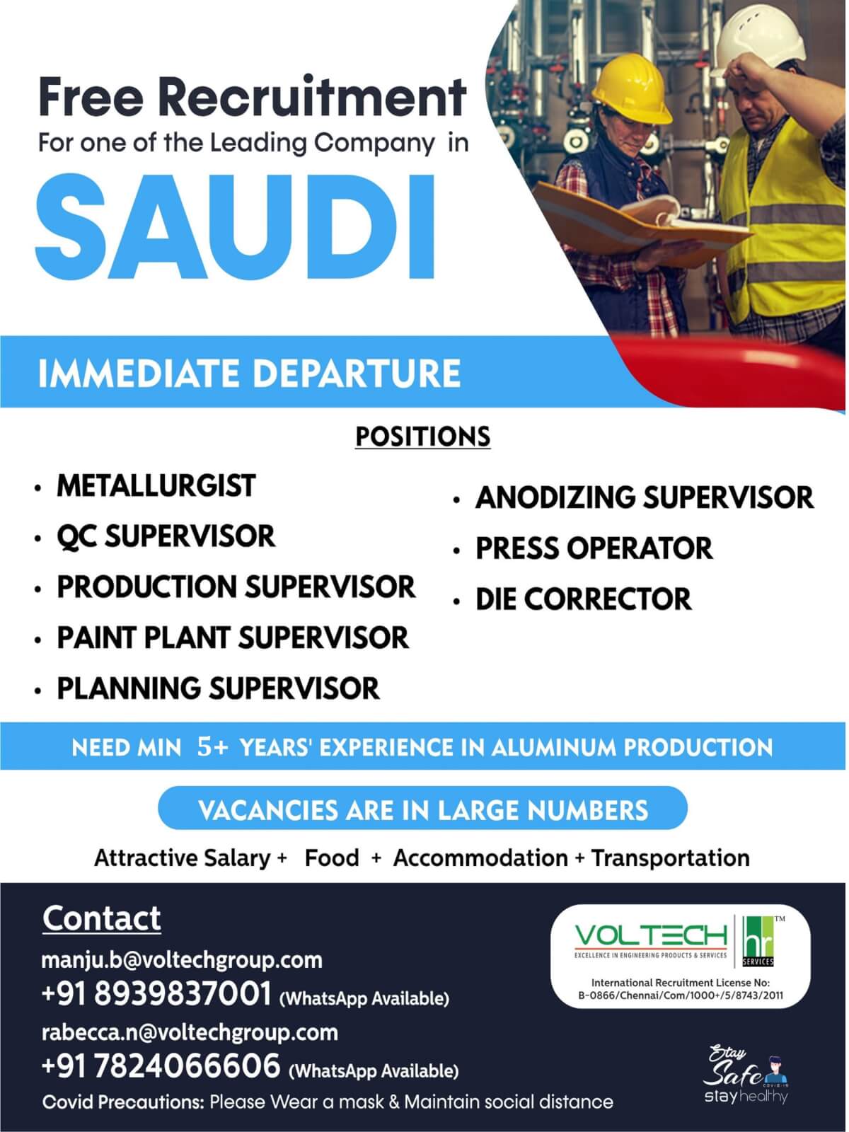 Free recruitment to Saudi arabia - Immediate Departure